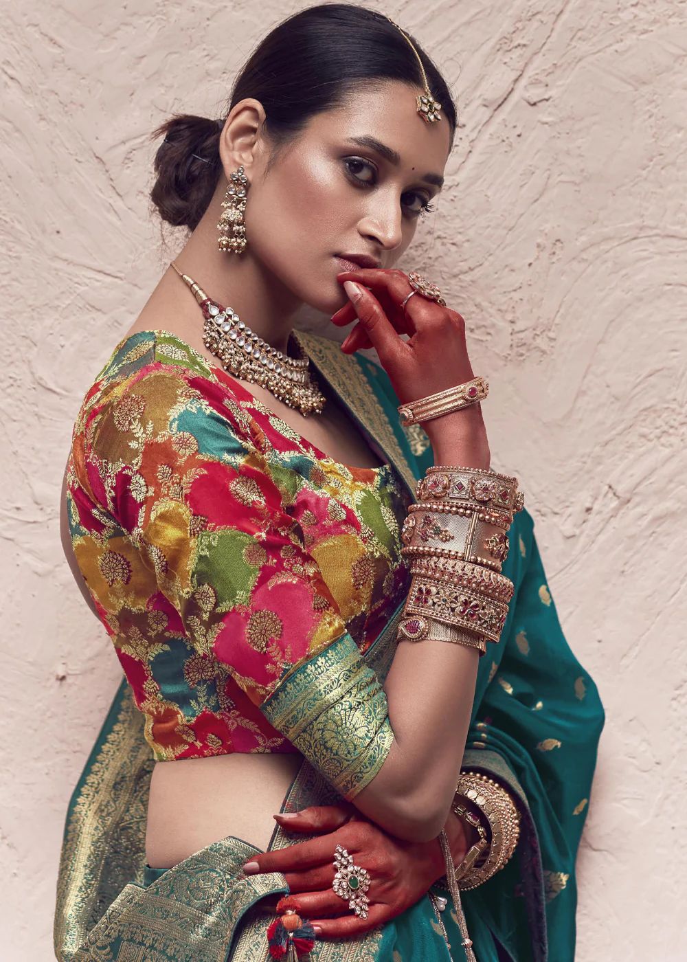 This exquisite Emerald Green Designer Banarasi Dola Silk Saree is a perfect fusion of heritage and modern elegance. Meticulously handwoven by skilled artisans, it showcases intricate patterns that celebrate India’s rich textile tradition. The luxurious silk fabric, with its radiant sheen and detailed craftsmanship, makes it an ideal choice for grand celebrations and special moments.