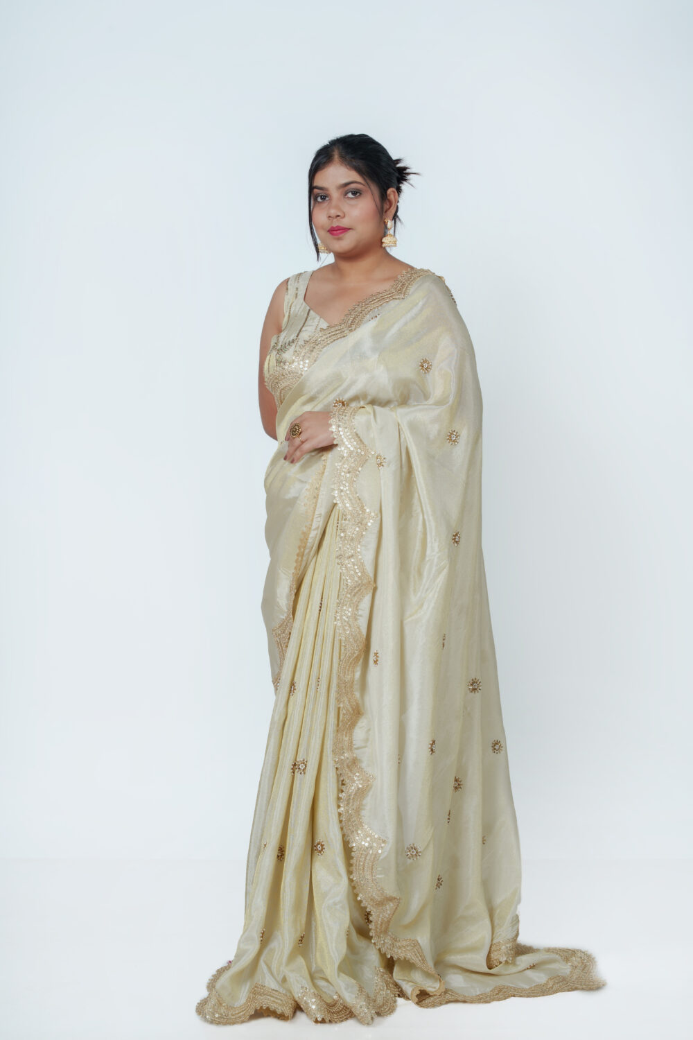 • Design: Crafted from lustrous viscose tissue, this saree features intricate all-over white and antique gold bead embroidery, elegantly finished with a delicate golden lace border.