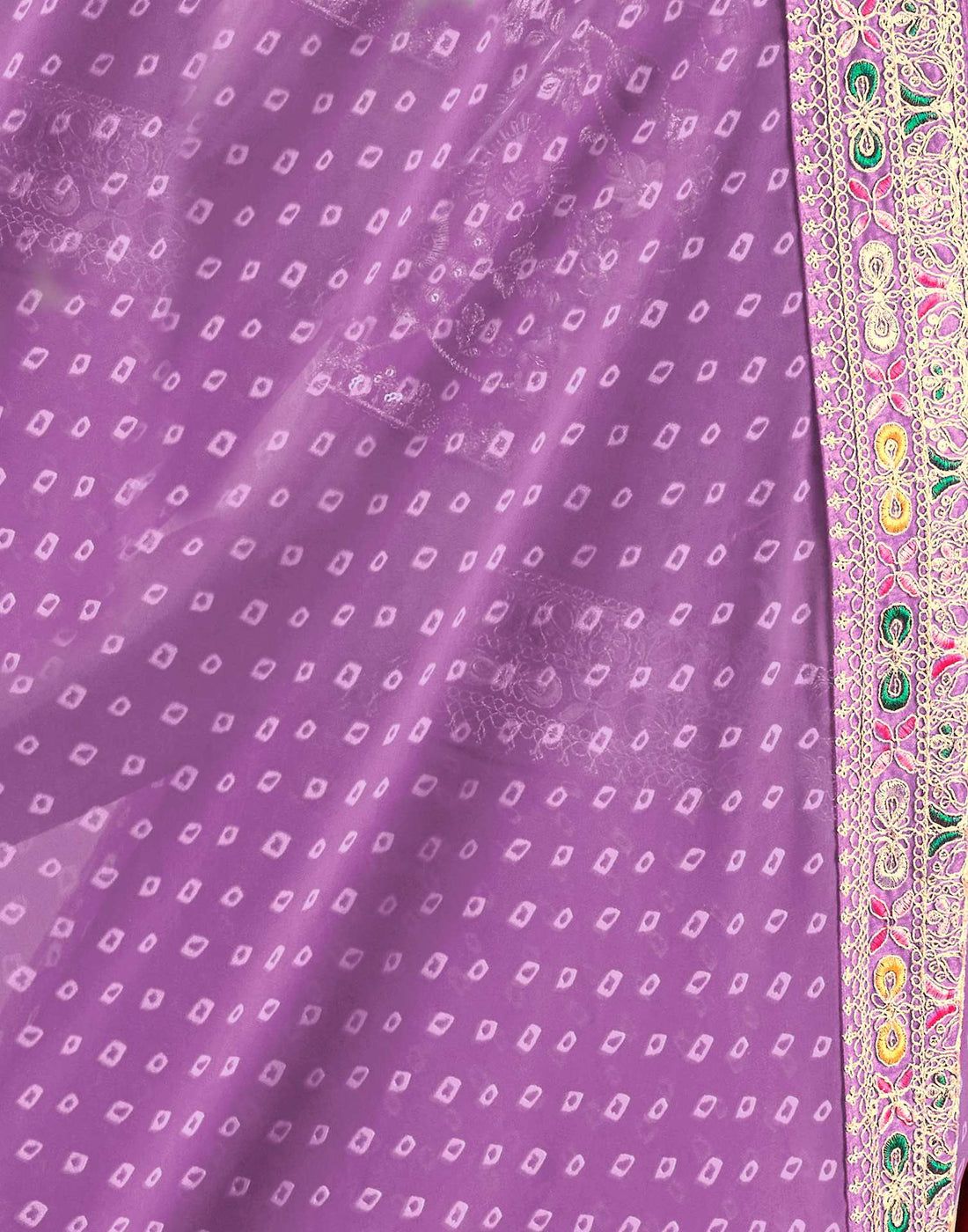 Embrace the timeless charm of tradition with our Ight Purple Bandhani Georgette Saree, beautifully adorned with intricate embroidered lace. The lightweight georgette fabric ensures a graceful drape, while the classic Bandhani patterns add a touch of cultural heritage. Enhanced with delicate embroidery along the borders, this saree effortlessly blends tradition with elegance, making it a perfect choice for festive occasions, weddings, and celebrations.