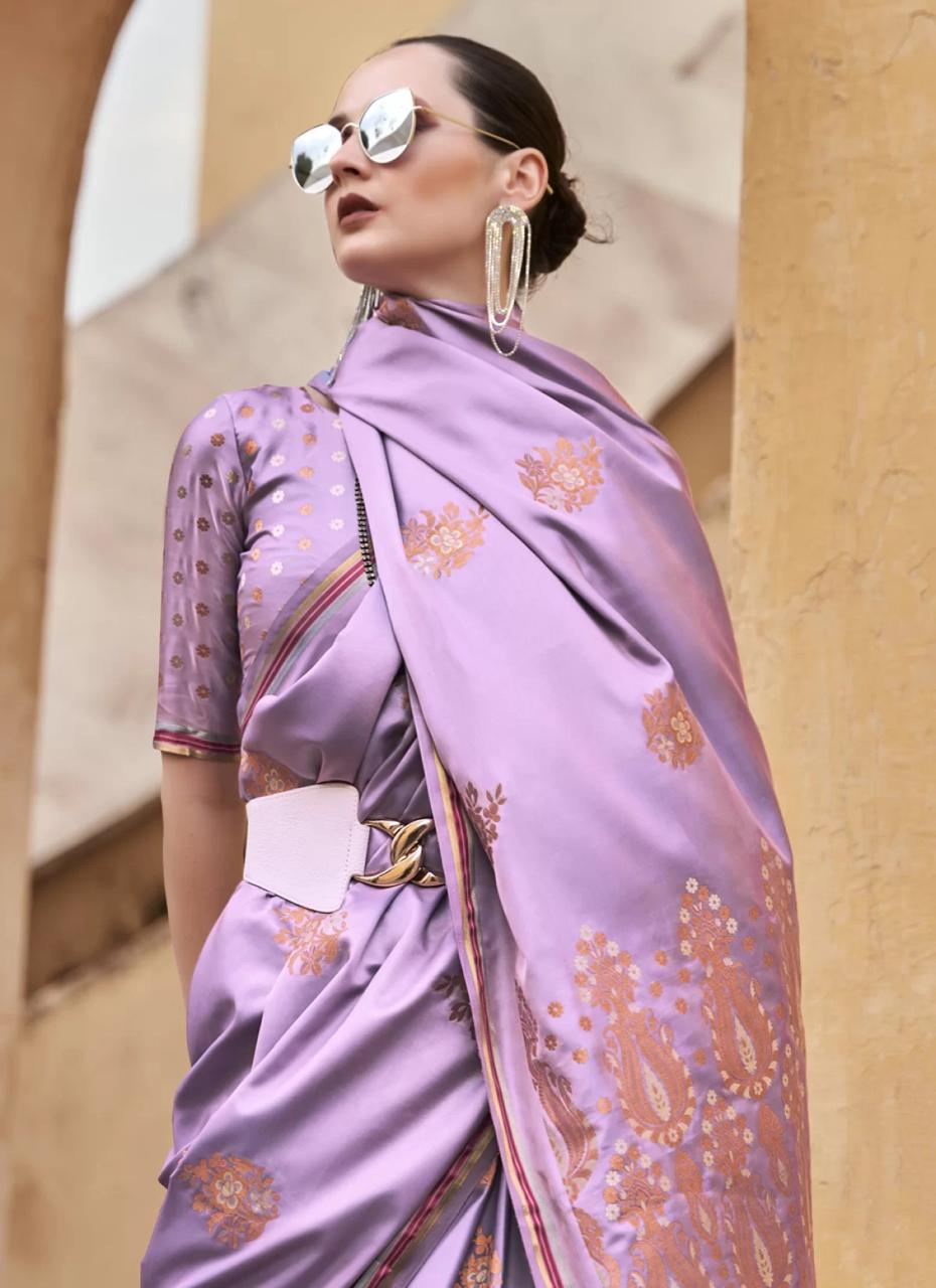 Elegant Lilac premium satin silk saree with exquisite woven detailing, perfect for a timeless and graceful look.