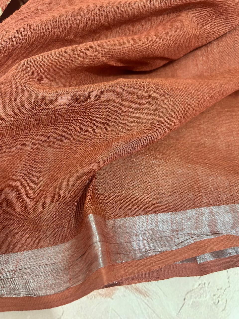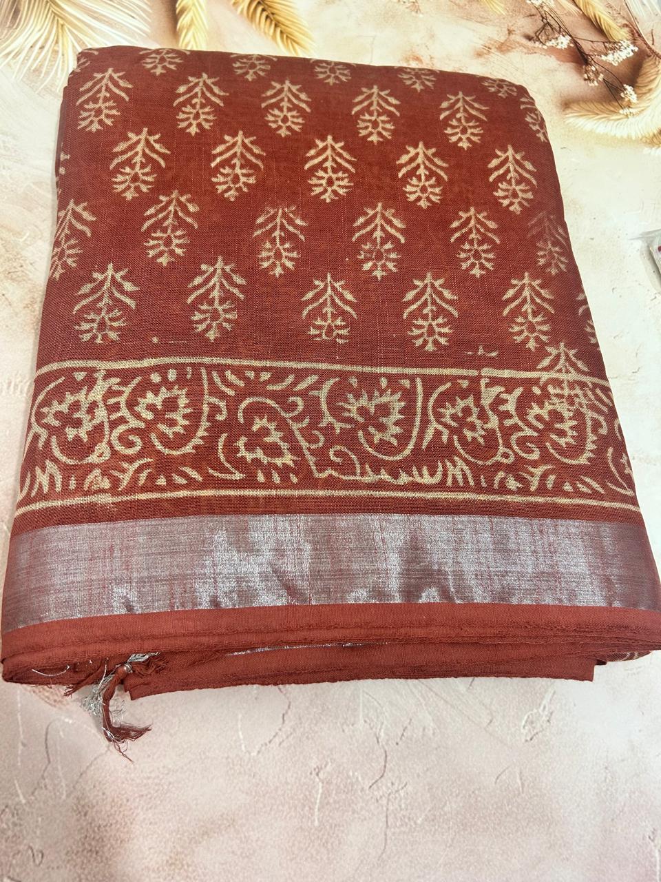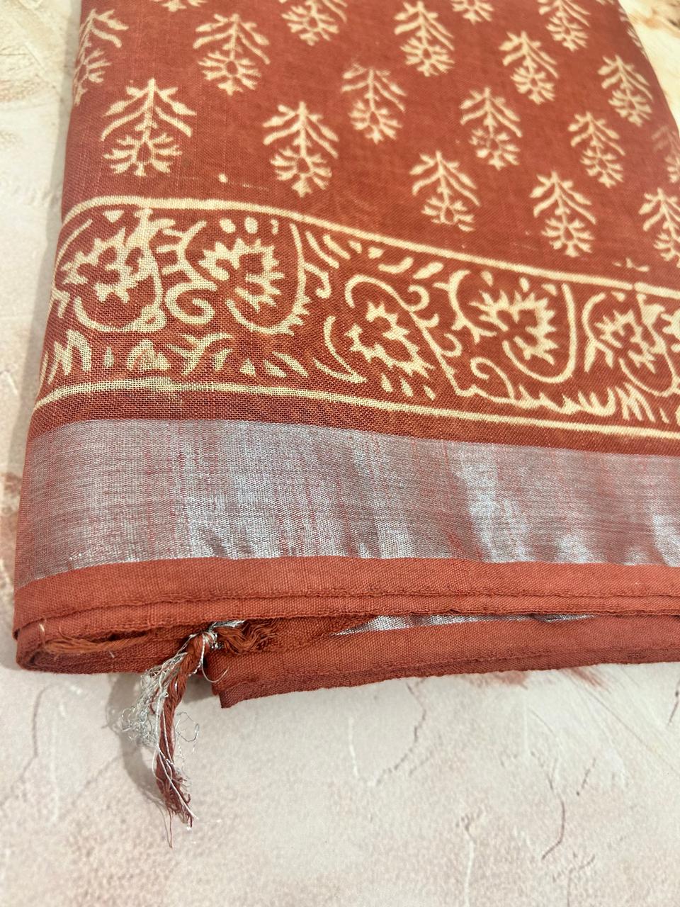 Timeless tradition meets understated elegance in this Linen Saree, adorned with classic Bagru print motifs and finished with a refined silver zari border.