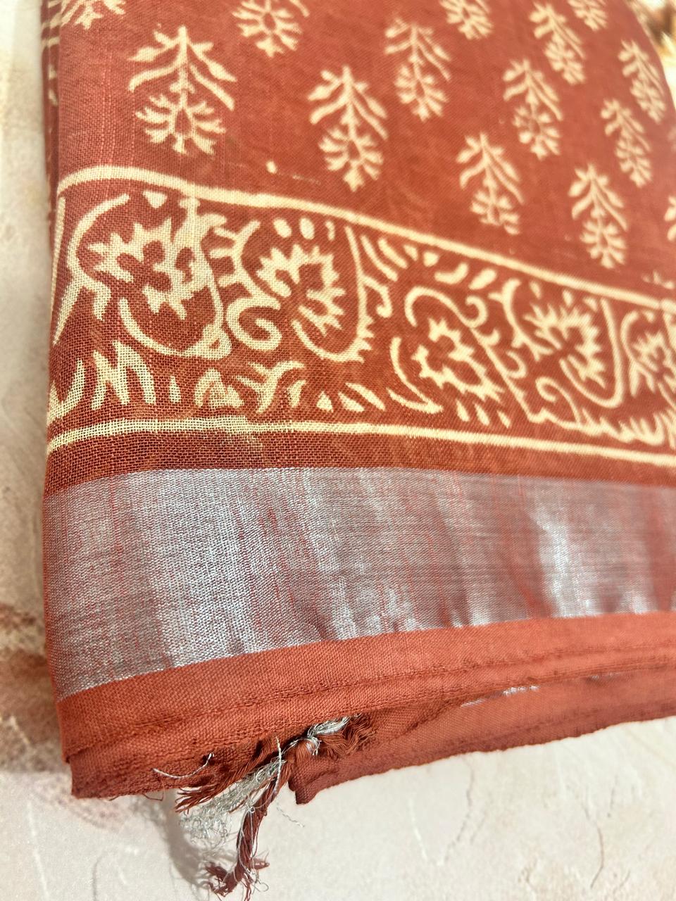 Crafted from breathable and lightweight linen, the saree offers effortless comfort while retaining its graceful structure. The natural texture of linen beautifully complements the hand-printed Bagru patterns, making it a perfect blend of heritage artistry and contemporary charm.