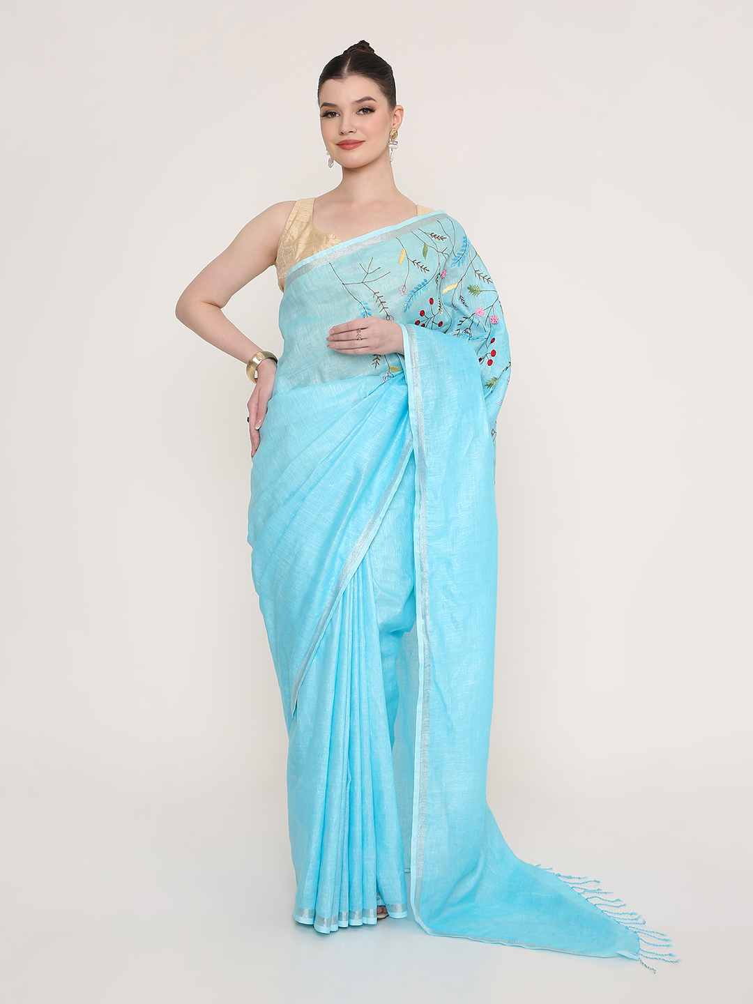 Be the first to review “Linen Saree With Thread Work Pallu”