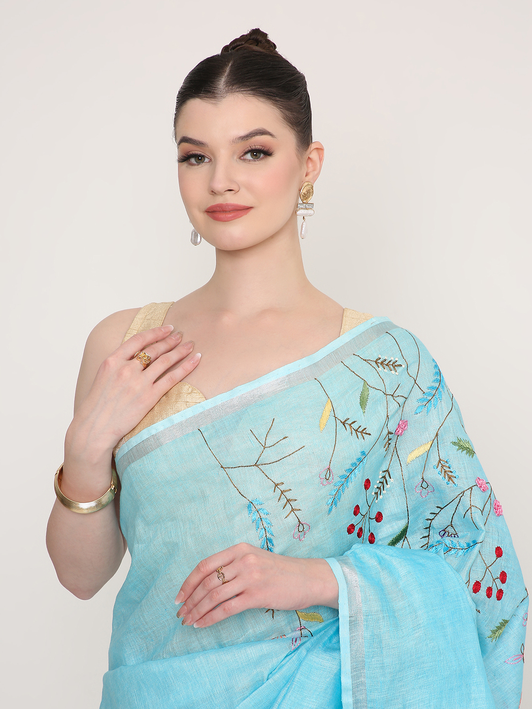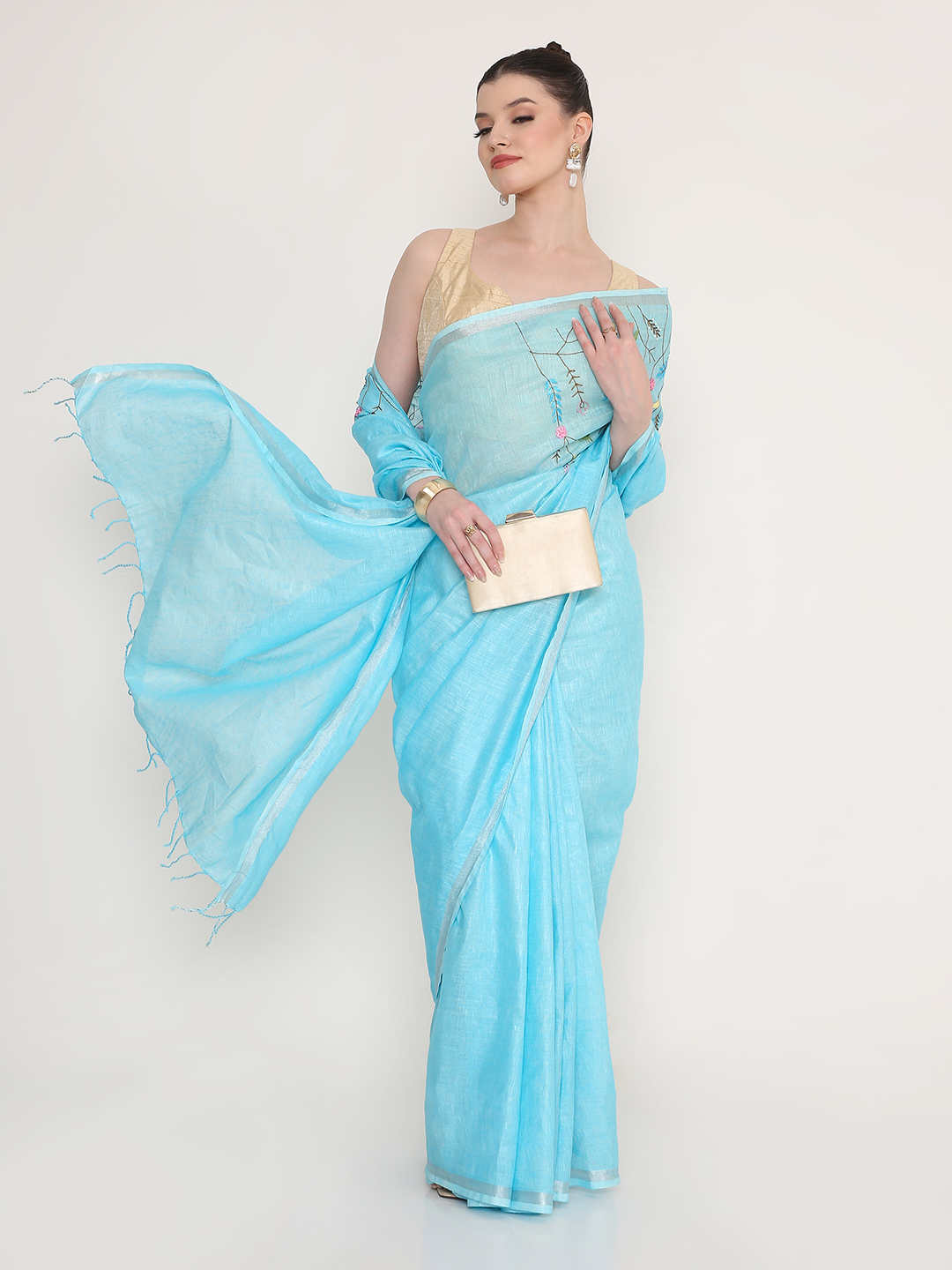 Crafted from premium linen, the fabric is breathable, lightweight, and comfortable to wear throughout the day. The intricate thread job on the pallu adds artisanal character, while the silver zari line introduces a gentle shimmer that enhances the saree’s overall appeal.